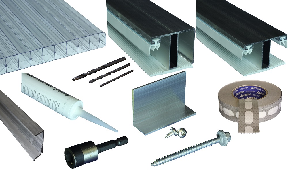 Kompletter Bausatz für eine Dacheindeckung mit Doppelstegplatten inklusive dem komplettem Montagezubehör bis hin zur letzten Schraube (ohne Unterbau).