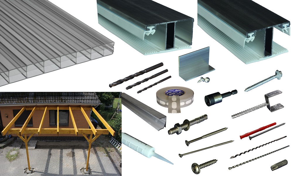 Dieses Set ist zusammengestellt aus der kompletten Unterkonstruktion aus Leimbindern, allen benötigten Verbindungs-Schrauben und den Pfostenträgern, sowie unseren 16 mm Stegplatten aus Polycarbonat in Braun-Bronze mit allen Alu/Gummi Rand- und Verbindungsprofilen, den dazu gehörigen Schrauben aus Edelstahl in ausreichender Menge inkl. dem passenden 3/8“ Steckschlüssel.