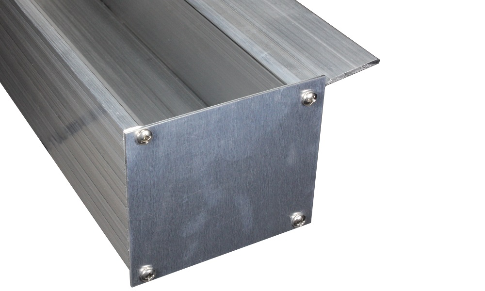 Bestehend aus: 2 Stück Kastenrinnen-Endkappen aus Aluminium in Pressblank und 8 VA-Schrauben