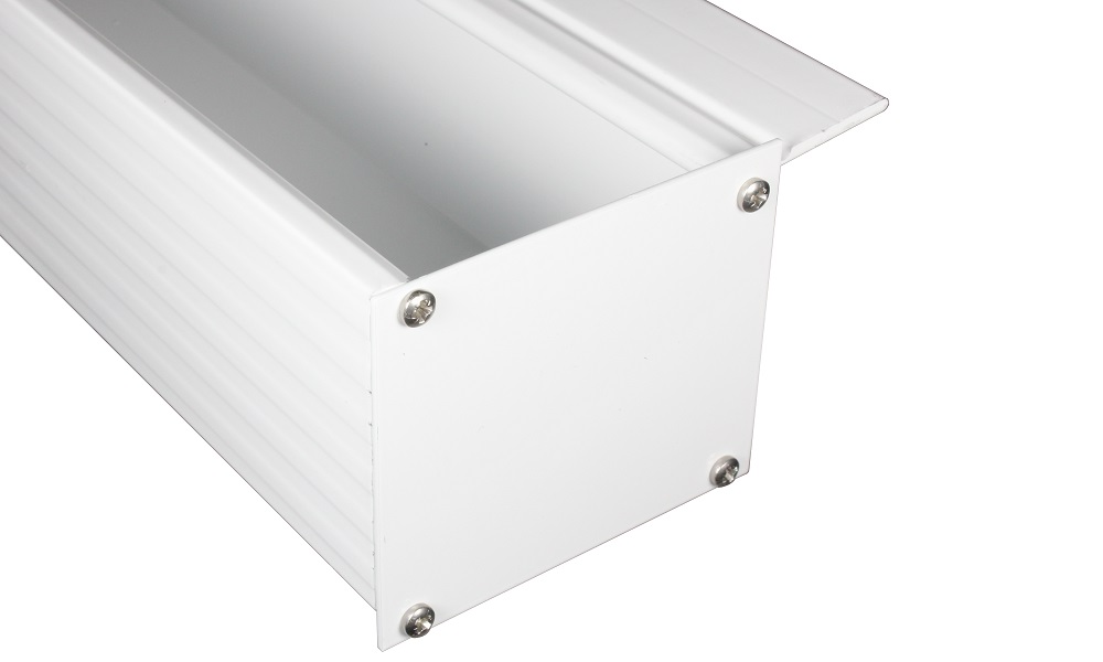Bestehend aus: 2 Stück Kastenrinnen-Endkappen aus Aluminium in Weiß und 8 VA-Schrauben