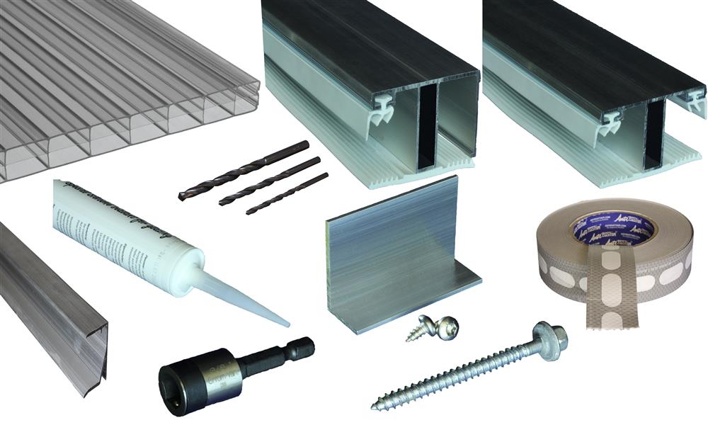 Kompletter Bausatz für eine Dacheindeckung mit Doppelstegplatten inklusive dem komplettem Montagezubehör bis hin zur letzten Schraube (ohne Unterbau).